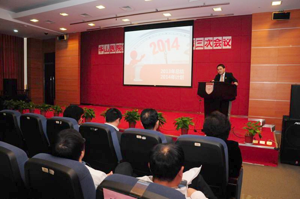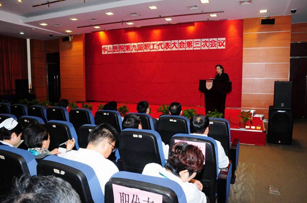 本次大会的主要内容是院党政领导干部述职和民主测评。丁强院长首先做《2013年总结和2014年计划》的报告并进行个人述职。在报告中,丁院长指出,2013年是华山的评审年、学科年和转型年,全面接受检阅、提升学科内涵和走好群众路线等3项重点工作出色完成,医疗、科研、教育、管理、党建、文明、后勤、拓展等8个方面的常规工作不断取得新成就,顺利通过JCI复评审和三甲医院复评审;新增5项国家临床重点专科建设项目,使该项目总数达20个,位列全市第2;引进6位高端人才;病房按学科进行整合调整;党的群众路线教育实践活动扎实推进。全年门急诊355.15万人次,出院6.32万人次,手术3.45万人次。2014年我们将深化学科建设,加强人才培养,深入管理改革,振奋员工精神。顾小萍书记做《2013年党委工作》的报告并进行个人述职。在报告中,顾书记回顾了职能部门干部4年1次的换届考核和党的群众路线教育实践活动这2项重点工作,以及党建基础工作、干部队伍建设、精神文明建设、医院文化建设与宣传推优、工会团委妇委会工作、纪检监察工作、离退休干部工作和学生党建工作等8个方面常规工作所取得的成就。随后,汪志明、邵建华、马昕、毛颖、靳建平、徐文东副院长和邹和建、耿道颖副书记先后汇报了分管工作,从德、能、勤、绩、廉5个方面进行述职。与会职代表和中层干部认真填写了医院领导班子、党政正职领导干部、党政副职领导干部的民主测评表以及《院务公开职工满意度测评表》和《华山医院第九届第三次职工代表大会质量评估表》。