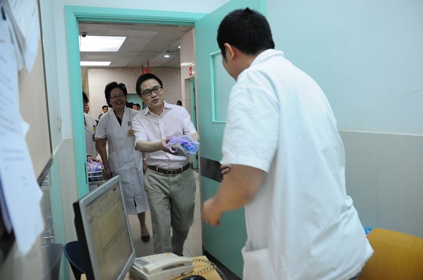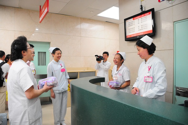又逢酷暑时节,8月5日下午,我院丁强院长、党委顾小萍书记、邵建华副院长、靳建平副院长、耿道颖副书记等院领导汇同党办、工会、文明办、门诊部等部门负责人一行,走访了门急诊等多个部门,亲切慰问奋战在一线的华山人。每到一处,院领导班子都会为职工送上清凉油、毛巾、驱蚊液、菊花茶、香皂等防暑套装,关切询问各岗位的排班、工作量等情况,感谢大家的辛勤付出并叮嘱注意休息。