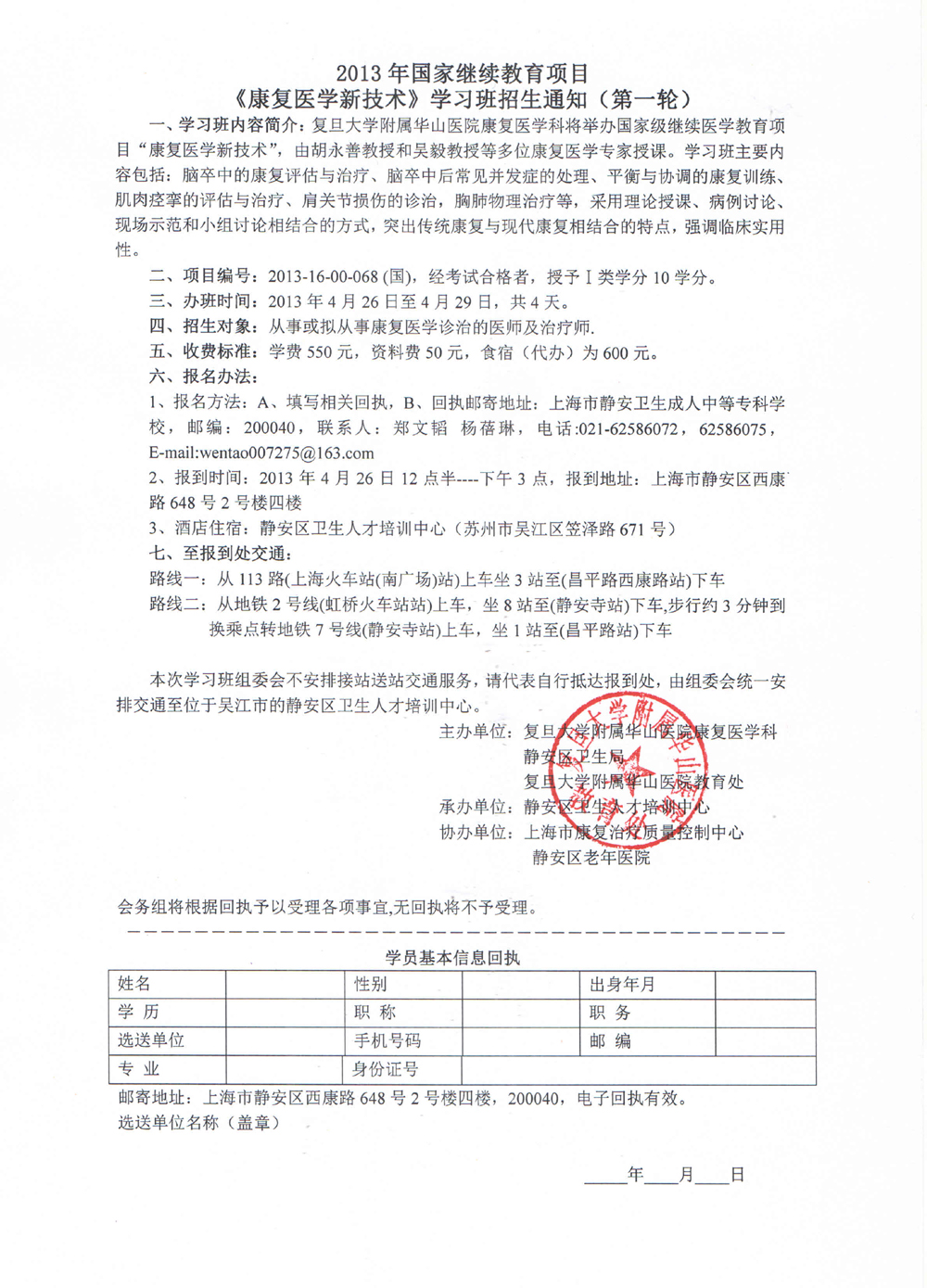 2013年国家继续教育项目《康复医学新技术》学习班招生通知(第一轮)