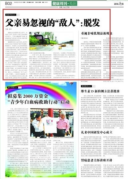 医生手记父亲易忽视的“敌人”:脱发2012年6月19日 B02:B02-健康周刊·关注 稿件来源:新闻晚报 作者:徐峰 刚刚过去的星期日是父亲节。在我的门诊中,见到不少陪父亲来看病的年轻人。父亲支撑起整个家庭,是家庭里每个成员的守护神,但面对疾病,他也需要更多的关怀。