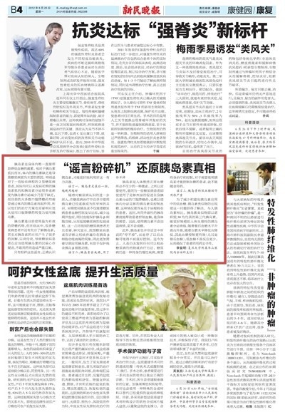 “谣言粉碎机”还原胰岛素真相 胰岛素是身体内唯一直接帮助降低血糖的激素。相对于胰岛素抵抗而言,体内的胰岛素缺乏是导致糖尿病更为主要的原因。特别是对于一些较长病程的2型糖尿病患者,其体内可以从发病初期的胰岛素抵抗和胰岛素分泌增多逐渐变为胰岛素分泌减少乃至于缺乏,而目前的大多数口服降糖药均需要通过体内的胰岛素而起作用,所以他们的治疗方案也需要相应地从使用口服降糖药转变为使用胰岛素。 胰岛素是目前使用最为有效的降糖药物,但在临床中,很多糖尿病患者并没有充分了解胰岛素,甚至对胰岛素的应用产生了很多的误解,以讹传讹,导致糖尿病患者在应当使用胰岛素的时候心存疑虑,不敢用药而造成严重后果。 只有粉碎这些谣言,正确认识胰岛素,才能更好地利用好这一有力武器。 谣言一:胰岛素是最后一招,越晚用越好 随着对糖尿病认识的进一步深入,在糖尿病治疗中应尽早使用胰岛素已经逐渐成为医学界的共识。早期使用胰岛素不仅能使糖尿病患者血糖控制及早达标,减少远期并发症,同时也能保护胰岛β细胞功能,从而延缓糖尿病的发展进程。这一点对我国的糖尿病患者尤其重要,研究显示,我国糖尿病患者在诊断之初就普遍存在胰岛β细胞功能衰竭的现象,因此更加需要早期应用胰岛素,有助于保护残余胰岛β细胞功能。 谣言二:胰岛素会成瘾,用了停不掉 胰岛素是人体维持正常血糖所必不可少的一种激素。之所以需要使用,是因为一些糖尿病患者即使使用了足够剂量的促进自身胰岛素分泌的口服降糖药,也难以使体内分泌足够的胰岛素来控制血糖,这种情况更容易见于病程较长的患者。这时,利用外源性的胰岛素就能帮助患者控制血糖,是身体的需要。因此,使用胰岛素不会加重病情,更不会成瘾。 此外,胰岛素也并非谣言中所说的“停不掉”,而是停了以后血糖可能得不到良好控制。迄今为止,人类仍未发明任何可以根治糖尿病的药物或治疗方法,糖尿病仍是一种终身的慢性疾病,需要终身治疗和控制。对于需要使用胰岛素才能控制血糖的患者,就不能随意停药。 谣言三:胰岛素的低血糖副作用很严重 为了减少和避免胰岛素应用中的低血糖,胰岛素类似物的出现使这一问题获得了解决。与人胰岛素相比,胰岛素类似物即以诺和锐30为代表的第三代胰岛素,能更好地模拟人体生理性的胰岛素分泌曲线,随着餐后血糖水平升高而升高,随着血糖水平降低而降低,因此血糖控制更有效(尤其是餐后血糖),低血糖不良反应更少,从而确保了患者的用药安全性。 李益明(复旦大学附属华山医院内分泌科主任)