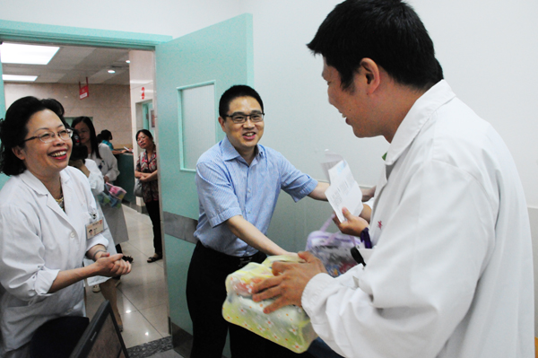 入夏以来,我院门急诊量大幅上升,尤其是皮肤科就诊人数徒增,每日均在10000人次以上,给一线职工带来巨大的压力。在走访慰问中,院领导班子给医院员工送上了驱蚊液、毛巾、饮料等夏令用品,还关切地询问了各岗位的运作情况,叮嘱职工注意自我调节,做好防暑降温工作。