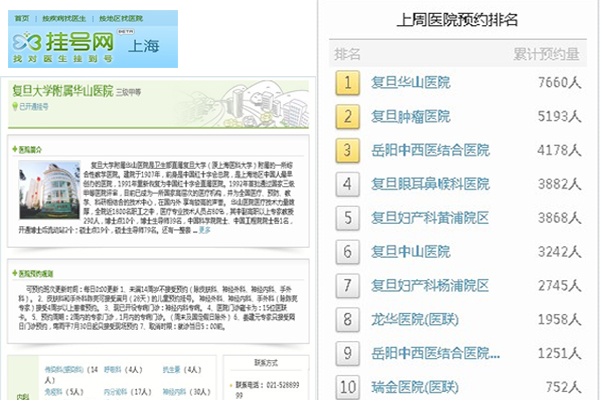 7月31日起,上海市统一的预约挂号服务平台全面升级,运行一周以来统计了全市各大医院的门诊预约量,我院以7660人次位列全市第一。随着预约诊疗的深入开展,目前我院每月的预约量已经占到门诊总量的12%,占到专家门诊总量的59%,在数量上、预约形式上均走在行业前列。