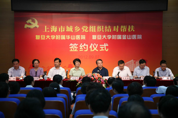 9月7日下午,复旦大学附属华山医院党委与复旦大学附属金山医院党委城乡党组织结对帮扶在新建的金山医院正式签约。市教卫党委杜慧芳副书记、市卫生局瞿介明副局长、金山区委祝学军副书记、区委常委组织部长陈正安、贾炜副区长以及我院丁强院长、党委顾小萍书记、钱飚副书记、金山医院洪震院长、党委陈刚书记等出席签约仪式。 此次结对帮扶是在市教卫党委、市卫生局和金山区委的关心支持下促成的。两兄弟医院党委将以服务群众为出发点和切入点,在党员互动共建、定期志愿者服务、救治危重病人绿色通道、提升中层干部执行力、精神文明建设等多方面进行重点帮扶,激励双方广大党员干部争做表率、争当先锋,有效促进双方的党建工作,充分发挥双方党组织推动发展、服务群众、凝聚人心、促进和谐的作用。 在洪震院长介绍了金山医院基本情况后,顾小萍书记和陈刚书记在帮扶协议上签字。随后顾书记以一场精彩的《加强医院文化与党风廉政建设》的专题演讲,拉开了两院党委结对帮扶城乡共建的美好序幕。 |