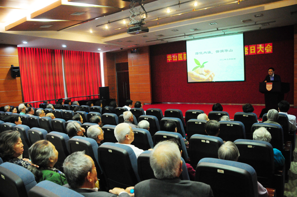 10月23日下午,2012年“华山医院欢度第二十五个敬老日大会”在我院门诊十二楼隆重召开,300多位我院离退休职工带着回娘家的心情回到他们曾经奉献一生的单位,共叙旧事,畅谈甚欢。大会由我院汪志明副院长主持,丁强院长、顾小萍书记、邵建华副院长、耿道颖副书记等领导出席大会,代表医院向离退休职工致以了节日的问候。 丁强院长向老人们介绍了华山医院2012年在医教研、精神文明、医院管理、对外拓展等工作中取得的成绩。丁院长深情感谢了老职工为华山做出的贡献,强调老同志的经验和智慧是华山最宝贵的财富。顾小萍书记代表医院党政作敬老节贺词,感谢老同志们仍然积极为医院进言献策,关注医院建设和青年医生的成长,在社会上宣传和维护华山的形象,希望大家今后继续发挥余热,共同再创华山新百年的辉煌。退管会戚琴副主任向老同志们介绍了退管会一年来发挥桥梁纽带作用,努力让“娘家”更温馨的工作,配以精彩生动的活动照片,让老同志们笑声连连。老人们纷纷表示为华山的今天感到高兴,医院取得的傲人成绩是他们天伦之年的最大骄傲。此外,老人们欣赏了由我院退休职工自己表演的腰鼓节目视频,共庆佳节。 |