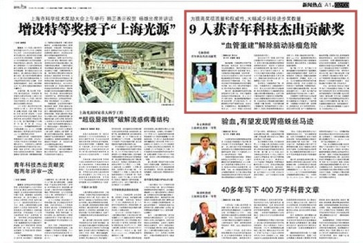 “血管重建”解除脑动脉瘤危险 毛颖教授青年科技杰出贡献奖 2013年4月19日 A1叠0203:A1叠0203-新闻热点 稿件来源:新闻晚报 作者:贺天宝/吴瑞莲