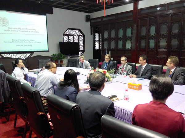 10月16日下午,德国勃林格殷格翰医学部全球副总裁Christopher D. Corsico、Klaus A. Dugi等一行8人来我院神经内科交流访问,并调研由神经内科牵头的上海市脑卒中预防与救治服务体系。神经内科副主任董强教授、程忻副主任医师等在花园大厅热情接待了外宾。 董强教授首先致辞,表达了对客人的热烈欢迎。随后程忻副主任医师介绍了中国急性脑梗死静脉溶栓治疗现状、上海公共卫生体系建设新三年服务计划如何推进本市脑卒中规范化预防与救治体系,以及启动由勃林格殷格翰公司支持的MOST项目后,上海MOST体系医院溶栓治疗相关数据。Corsico副总裁表示,对华山医院神经内科在急性脑梗死治疗工作同时设立“7天-24小时”待命溶栓团队留下了非常深刻的印象,对于华山医院牵头打造的上海市脑血管病急救网络感到非常赞叹。双方还就如何进一步提高上海地区急性脑梗死患者治疗质量,减少院前及院内延误等流程改进,提高缺血性卒中患者静脉溶栓治疗率等等问题进行了深入的探讨和交流。 据悉,德国勃林格殷格翰集团为全球领先医药公司,在全球拥有145家分支机构。为提高急性脑梗死患者救治率及救治质量,作为“十二五”国家科技支撑计划,启动了由勃林格殷格翰支持的MOST项目,该项目的核心目标是在“十二五”期间缩短急性缺血性卒中患者到院至溶栓时间,提高时间窗内患者溶栓治疗率。