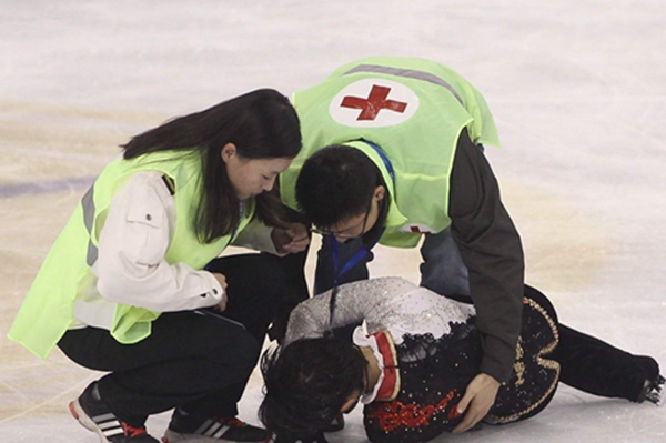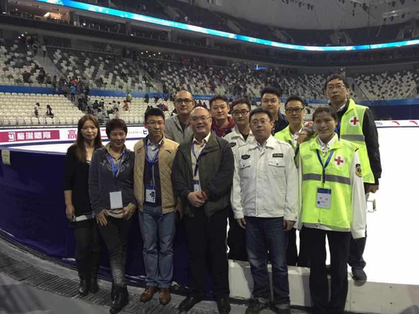 中国杯世界花样滑冰大奖赛(花样滑冰中国杯),是国际滑冰联盟(ISU)主办的世界花样滑冰大奖赛六个分站赛之一,2014年赛事于11月6至9日在上海东方体育中心举行。由我院运动医学科张健医生担任首席医务官、运动医学科陈家瑞、外科茅翔、杨光华医生和ICU沈丽臻护士以及2组120急救中心人员组成的临时团队承担赛事的医疗保障任务。 11月8日晚间男子单人自由滑比赛时,新科冬奥会和世锦赛双冠王、日本选手羽生结弦,与2013花样滑冰中国杯冠军、中国选手严涵意外相撞,双双倒地。稍作停留,严涵自己站了起来,缓慢滑出场地,但羽生结弦面部出血,未能自行站起。经赛会裁判允许,张健医生带领急救人员快速对羽生结弦进行了简单救治,并搀扶至场外行进一步处置。同时,派出急救人员判断严涵的伤情。两名选手均因碰撞导致软组织挫裂伤。在对伤者进行处置和观察后,与受伤选手教练组、队医及赛事组委会紧急磋商,判定伤情较轻,且两位选手均坚持要完成比赛,最终赛事组委会同意两位选手参加自由滑。意外的碰撞对两位运动员的竞技水平的发挥有一定影响,比赛中两位选手均有不同程度的失误,最终羽生结弦以第二名完赛,严涵以第六名完赛。 结束比赛后,两位伤者在赛会急诊室接受了进一步的全面检查。日本选手因头部、下颌软组织挫裂伤,建议送院诊治,但其表示可以自行处置;中国选手因胸部疼痛及下颌挫裂伤,经120送至华山医院急诊科就诊。急诊值班医生仔细诊治后,建议其休息、院外观察,密切随访。 本次赛事出色的保障及紧急情况处置,受到赛事组委会的好评,再邀我院为2015年3月将在上海举办的花样滑冰世界锦标赛保驾护航。