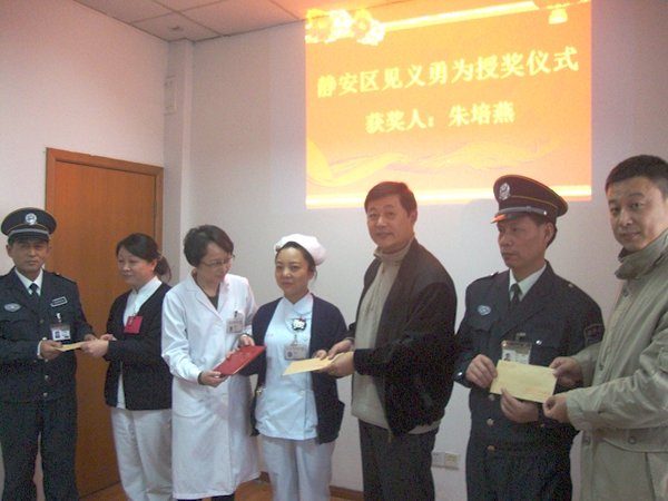 12月19日下午,我院急诊科护士朱培燕、保安程道宏和王德贵3名同志被授予静安区见义勇为先进分子荣誉称号,保卫处张佳文处长和护理部曹艳佩副主任携科室负责人为他们颁发了荣誉证书和奖金,并高度赞扬他们在医务人员的生命财产受到不法侵害的关键时刻能够挺身而出,不顾个人安危,成功擒获犯罪嫌疑人。 11月4日晚上7点半左右,朱培燕正在值班室里侧吃晚饭,一男子偷偷打开了值班室的门,潜入,并用螺丝刀在值班室外侧更衣箱撬窃。朱老师听到动静后,立即察问其进入护士值班室的原由,小偷见状撒腿就跑。面对小偷朱老师丝毫没有胆怯、退缩,不依不饶上前紧追不放,并大喊“抓住他”。这时正在附近的保安听到呼喊,立即将小偷按倒在地。小偷先是假装求饶,突然又起反抗,朱老师很警觉地提醒大家小偷身上还有一把螺丝刀,最终众人合力制服了小偷,移交给赶来的警察处理,经调查该小偷是流窜上海各大医院的惯犯。