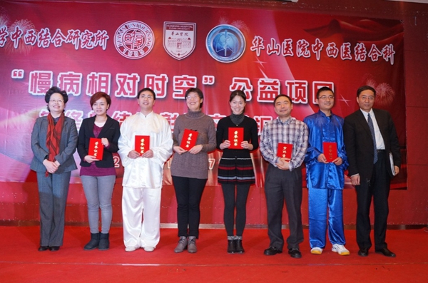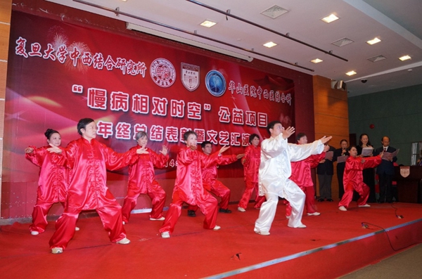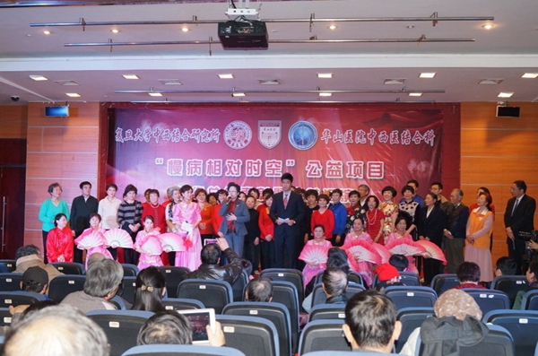 12月27日下午,我院中西医结合科在门诊12楼会场举办了“慢病相对时空”公益项目年终总结表彰暨文艺汇演。来自市委、市政府、军队、市卫计委、市科委、复旦大学的有关领导及各界爱心人士百余人应邀出席,他们和百余位肿瘤患者共同度过了一段美好的时光,云南青年干部志愿者、复旦大学同学会志愿者、上海戏剧学院志愿者以及来自人民日报、东方电视台、文汇报、新民晚报、大众卫生报、环境报、东方网、赛先生网站等媒体代表也到会为肿瘤病人战胜病魔加油、喝彩。