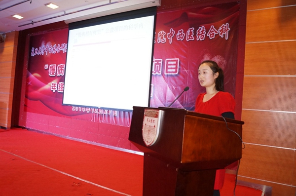 在中西医结合科杜懿杰医师介绍项目开展情况后,我院党委书记顾小萍、市卫生计生委党委书记黄红先后致辞,973首席科学家、复旦大学中西医结合研究所所长、华山医院中西医结合科主任董竞成教授做了《若干医学、替代医学措施对荷瘤机体微环境的正向影响》的科普讲座。