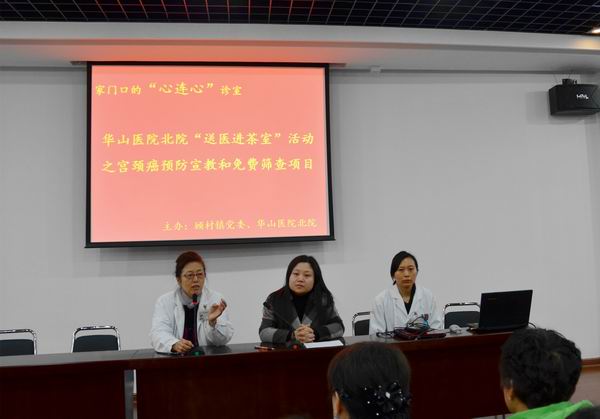 1月22~23日,北院“送医进茶室”活动之“宫颈癌预防宣教和免费筛查”项目在顾村镇顺利举行,第一站即为共富社区的169名适龄妇女进行了免费筛查。这标志着华山医院北院与顾村镇党委联手共推的公益志愿服务项目——“家门口的心连心诊室”2015年活动正式启动。