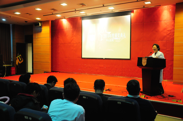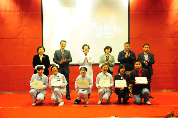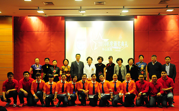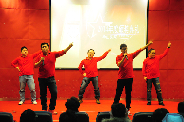 热闹欢快自编自导自演的暖场歌舞《快乐崇拜》后,华山医院2014年终大片《融合•转型•开掘——致敬“十二五”的这些年、这些人》倾情播放,门诊人在很多个熟悉的场景中看到了自己的身影,看到了在过去的一年里医院记录的自己的点点滴滴。每天在华山医院进进出出那么多病人,门诊就是展示华山的最大窗口。一系列优化就医流程、缩短病人等候时间的改革、各种形式的志愿者活动、各项温馨服务举措的落实,让全国“巾帼文明岗”、上海市“三八红旗集体”和复旦大学“三八红旗集体”等荣誉纷至沓来,员工热情、高效、务实、廉洁、奉献的工作激情被进一步激发。马昕副院长宣读了表彰决定,耿道颖副书记宣读了各类表彰名单并介绍他们的事迹:优秀服务窗口——便民服务中心和门诊药房,创先争优窗口——门诊放射科和门诊5楼内科护理组,比学赶帮窗口——检验科、门诊4楼挂号小组和门诊4楼外科护理组;爱心天使——护理部的何维嘉、陈燕勤、童赟和李爱珍,温情服务——便民服务中心的苏晴、瞿晓俊和心电图室的钱锦,技术能手——挂号室的徐涛、马洪涛、胡清霞,收费处的李联佳、葛智俊、陆瑞卿、戴娟、陈红艳和闵晓军,文明诚信——门诊药房的陶竑伟、陆瑶、喻俐懿、陈琦和徐瑾,勤劳能干——保洁员张道安,见义勇为——保安周恒泉,温馨服务——电梯工王芹。获奖窗口代表和优秀员工一一上台接受院领导颁奖并合影留念。6位门诊女员工身着自己心爱的旗袍,仪态万方地走上舞台,展示婀娜的身姿和对美好生活的追求;5位生龙活虎的男员工身着大红T恤,跳了一曲活泼可爱的《小苹果》,引发满场笑声。