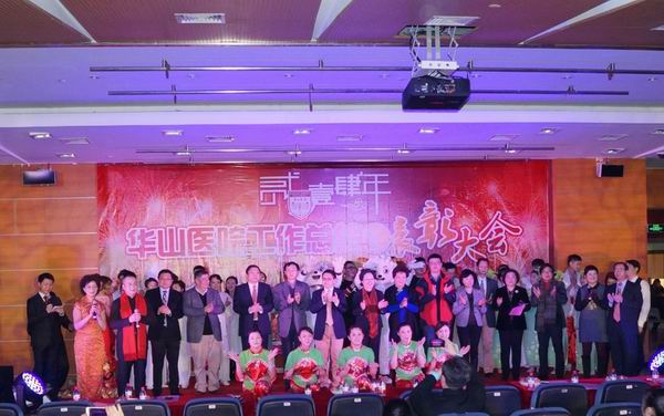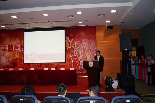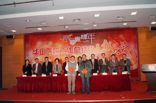 大会由丁强院长主持,奏国歌后,一部非常励志又饱含深情的短片《融合•转型•开掘——致敬“十二五”的这些年、这些人》回顾总结了华山人走过的辉煌的2014年。过去的这一年,华山人以“大医精诚,追求卓越”精神和敢为人先、不断创新的智慧,收获了医教研精神文明的累累硕果。今天,经过层层擂台评选的一批先进集体和个人获得隆重表彰,顾小萍书记宣读了表彰决定,汪志明、邵建华副院长、耿道颖、邹和建副书记、毛颖、马昕、徐文东和靳建平副院长分别宣读了2014年度获得院先进集体、优秀人才培养奖励计划考核优秀奖、院“九十佳”优秀华山人、市局级、校级先进集体、国家级、部市级、局级、校级优秀个人、国家级、部市级医教研各类奖项、入选各类部市级人才培养计划、入选医院优秀人才培养奖励计划、十佳优秀学生和优秀员工名单,并为23个院先进集体、4名优秀人才培养奖励计划考核优秀奖员工、100名各类“十佳”优秀华山人(十佳科技精英、十佳优秀教师、十佳临床医生、十佳医技工作者、十佳护理明星、十佳管理工作者、十佳医务青年、十佳窗口服务标兵、十佳优秀学生、北院十佳医务工作者)以及20名优秀员工颁奖,勉励获奖的集体和员工珍惜荣誉,再接再厉,发挥典型示范作用,也号召全体华山人学习先进,弘扬和践行社会主义核心价值观,为打造中国最具影响力的国际化优质医院、实现“中国梦”和“华山梦”贡献自己的智慧和力量。
