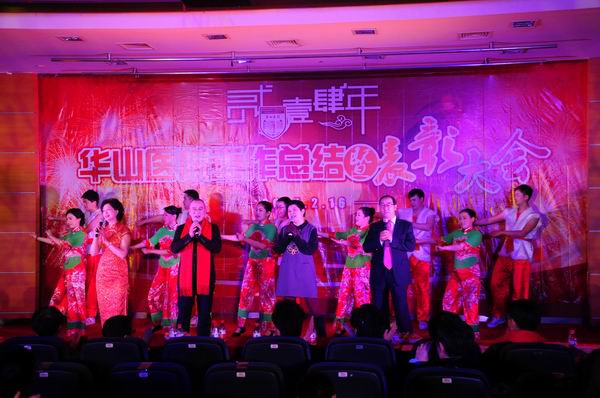 表彰大会后,是被誉为“华山春晚”的文艺汇演,华山员工和来自共建单位上海歌剧院的专业演员、基地学员、研究生们一起,献演了高雅大气、匠心独运的10个精彩节目,有情景对唱、器乐合奏、阿卡贝拉(无伴奏合唱)、中国风剑舞、美人吟、卷珠帘、沪剧、单簧管+钢琴、独唱和歌舞等,场面美轮美奂,流光溢彩,欢快喜庆,台上台下呼应,展示了多彩的华山医院文化。市卫计委党委副书记邬惊雷、市医务工会常务副主席张浩、上海歌剧院副院长李瑞祥、党总支书记范建华应邀观摩演出。
