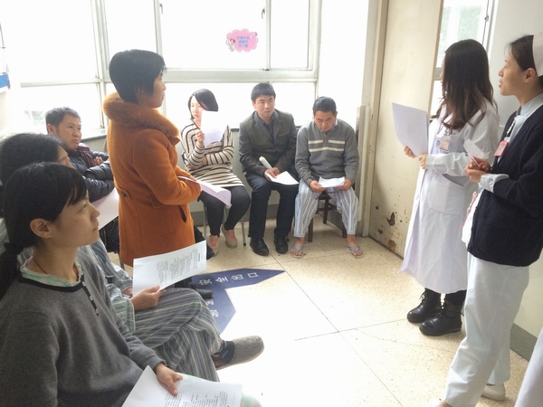 在3病区,颅内动脉瘤专病的健康宣教吸引了8位患者和家属前来参加。医务社工小沈向患者及家属们介绍了颅内动脉瘤的术前饮食保健方法以及术前术后注意事项,并示范了一套颈椎保健操,通过9组简单的练习,告诉患者和家属如何通过适当调节和放松,舒缓身心压力。在问答环节,大家纷纷提出了关于颅内动脉瘤手术及术后康复的不同困惑,周晓芬护士一一做了详细解答。其实,这次活动策划准备已久,早在去年年初,在护士长的介绍联络下,我院社工就在神经外科3病区启动了定期的个案探访,亲切的医患互动活动得到了护理团队与患者家属的肯定。基于前期的活动成果和经验,今年医务社工部围绕单病种疾病健康知识普及,策划了一系列的病区小组专题活动。这是2015年度的首次活动,得到了患者和家属的肯定和赞扬,纷纷表示专病讲座有的放矢,面对面的答疑解惑更是受益匪浅,以后一定还要参加。