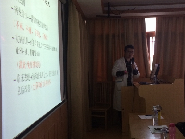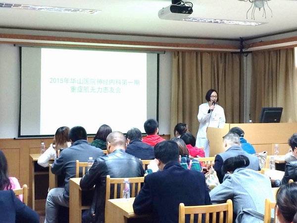 4月20日,华山医院神经内科成功举办了以“让无力者有力”为主题的第一期重症肌无力病友会,来自各地的50余名患者及家属参加。神经内科副主任卢家红教授致辞,赵重波教授讲解了该病重要的治疗药物糖皮质激素使用中的一些问题,周磊医生介绍了该病的特点、临床表现、检查和治疗方法,并提出该病与胸腺和甲状腺疾病关系密切,应同时治疗,还应注意避免使用氨基糖苷类抗生素、肉毒素等几类药物,以防加重病情。来自好大夫网站的郭慧甜女士介绍了如何利用网络平台和移动媒介建立自己的电子病历,方便医患沟通,轻松管理疾病。最后,赵重波教授和周磊医生一一详细解答了病友们的提问。