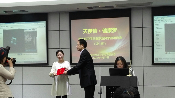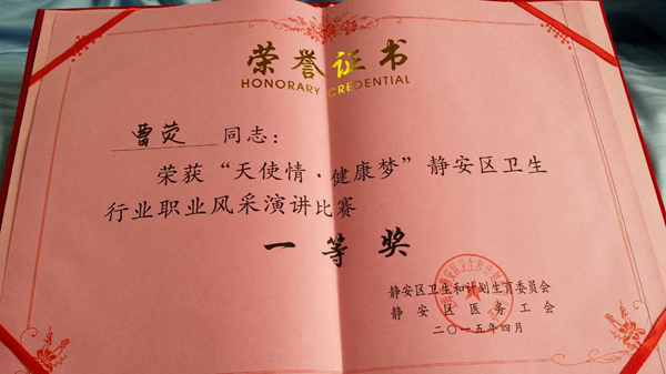 在4月23日举办的“天使情,健康梦”静安区卫生行业职业风采演讲比赛上,我院护理部曹荧凭借扎实的功力、出色的现场表现力和感人的器官捐献事例,获得由静安区卫计委领导、上海市护理学会领导和上海市卫计委医政管理处领导组成的评委团以及来自静安区各大医院组成的观摩团的一致好评,荣获一等奖。