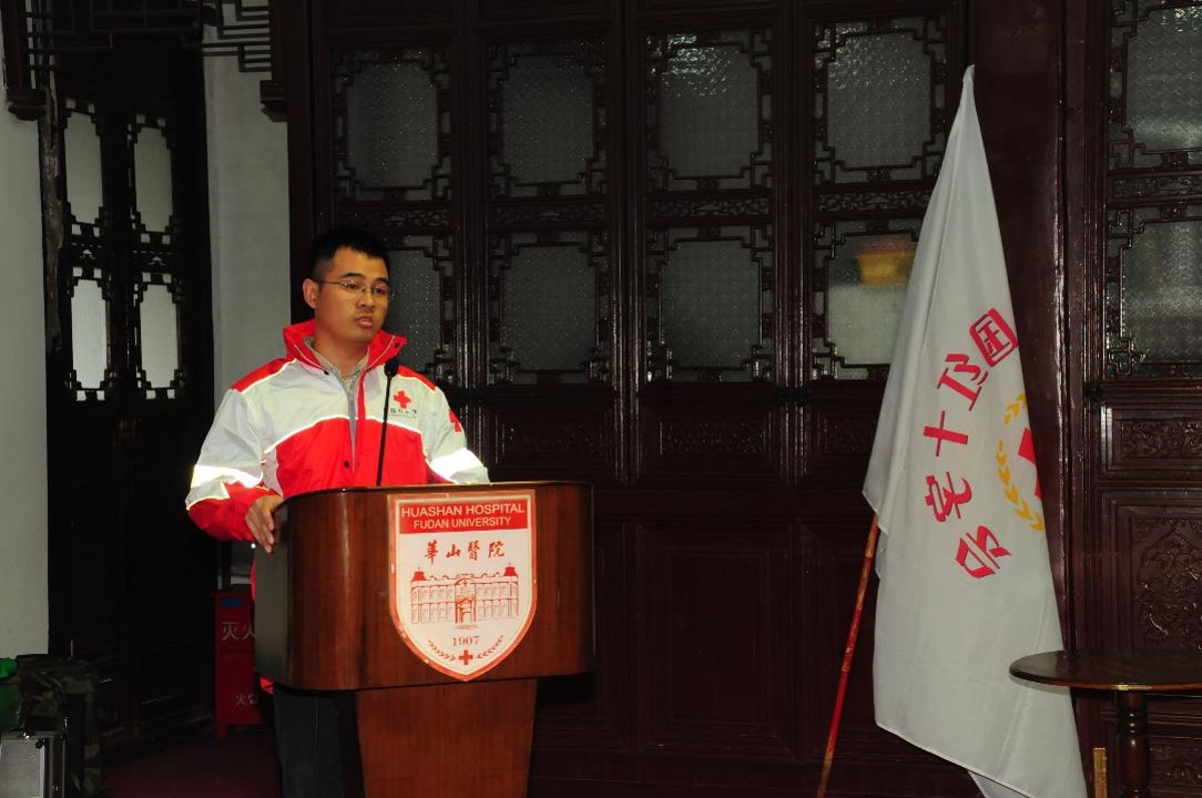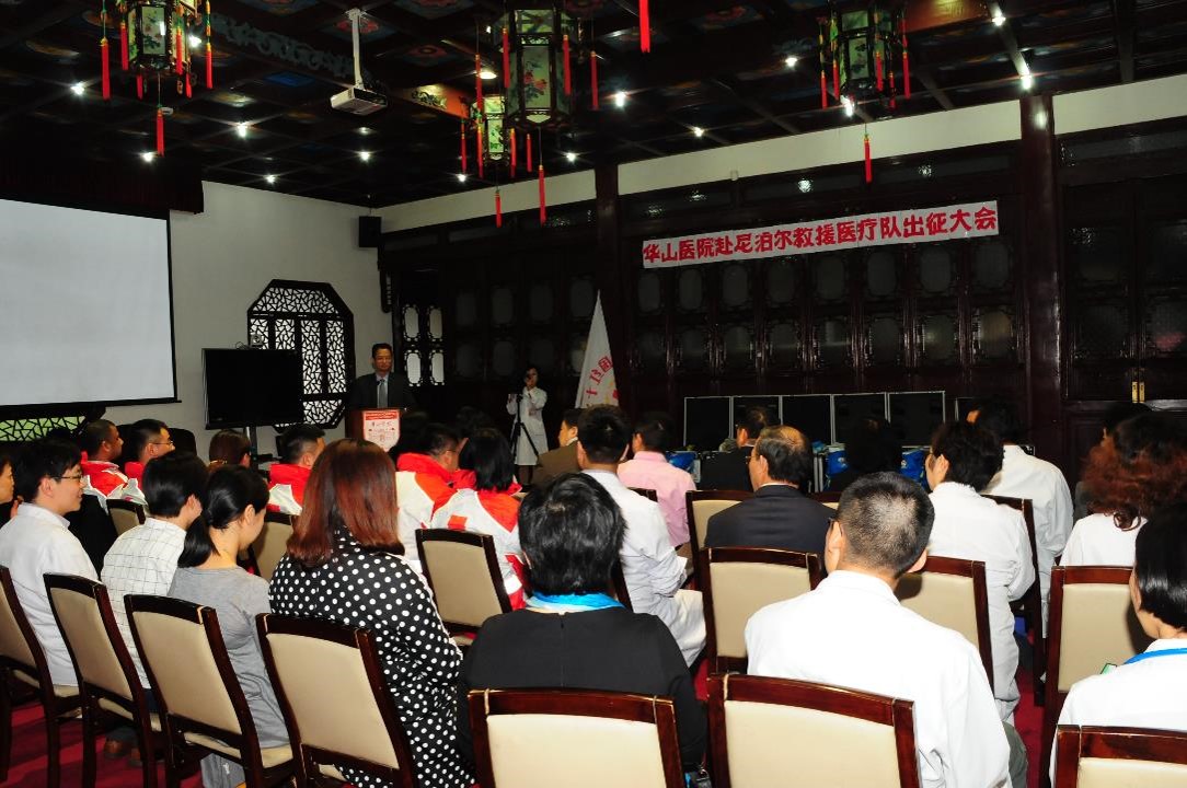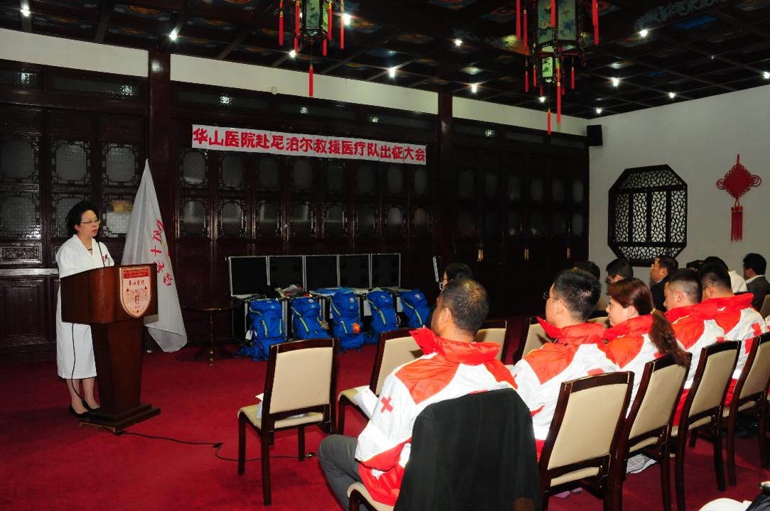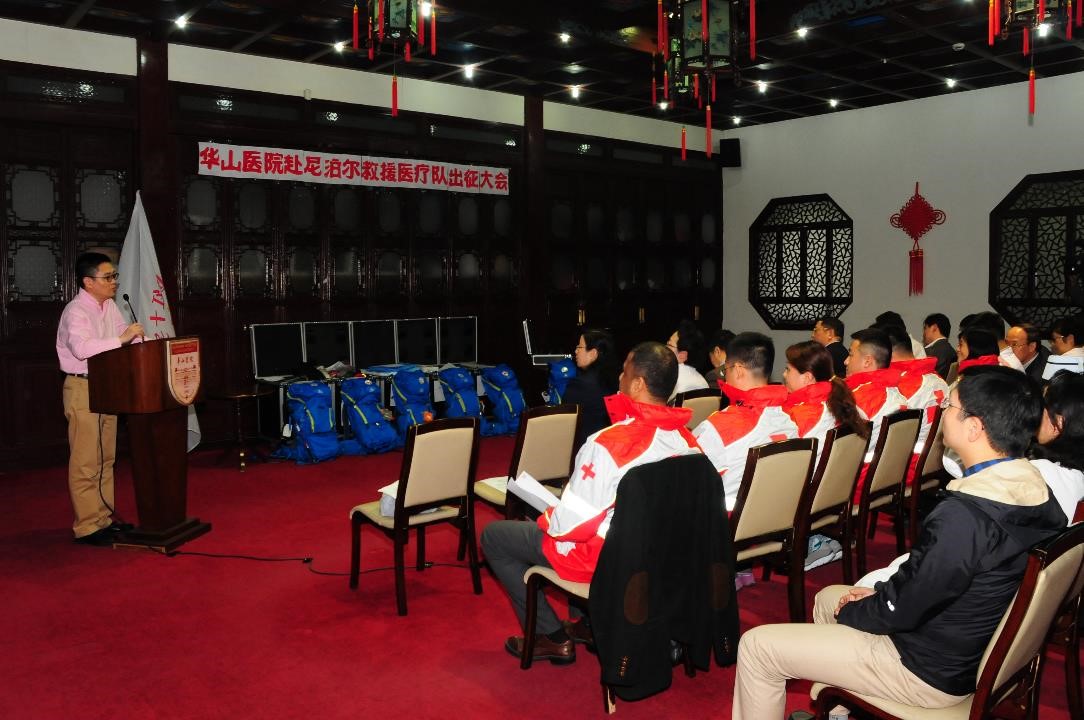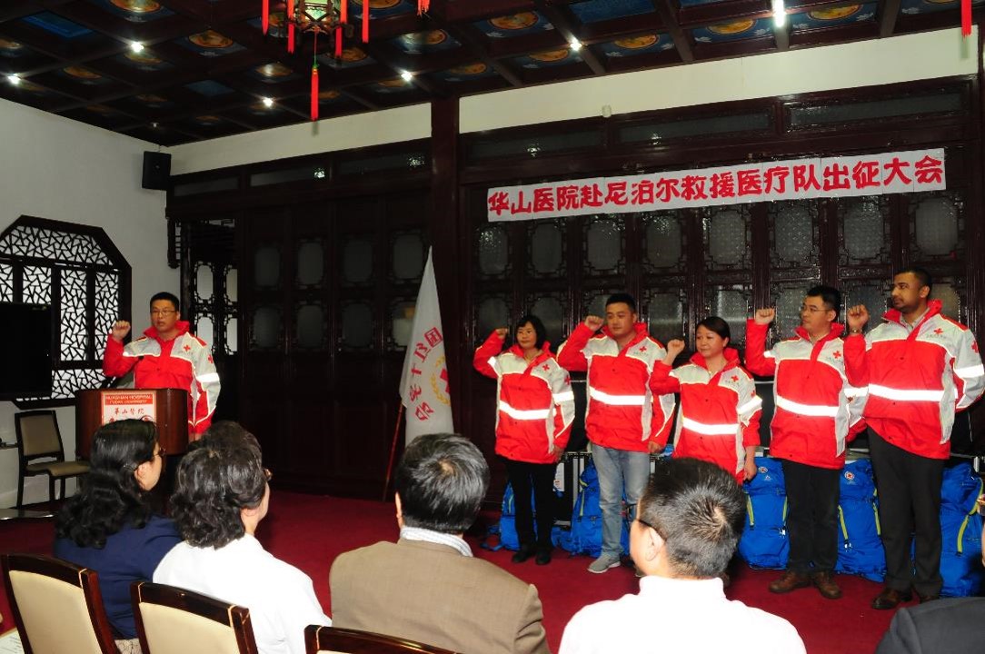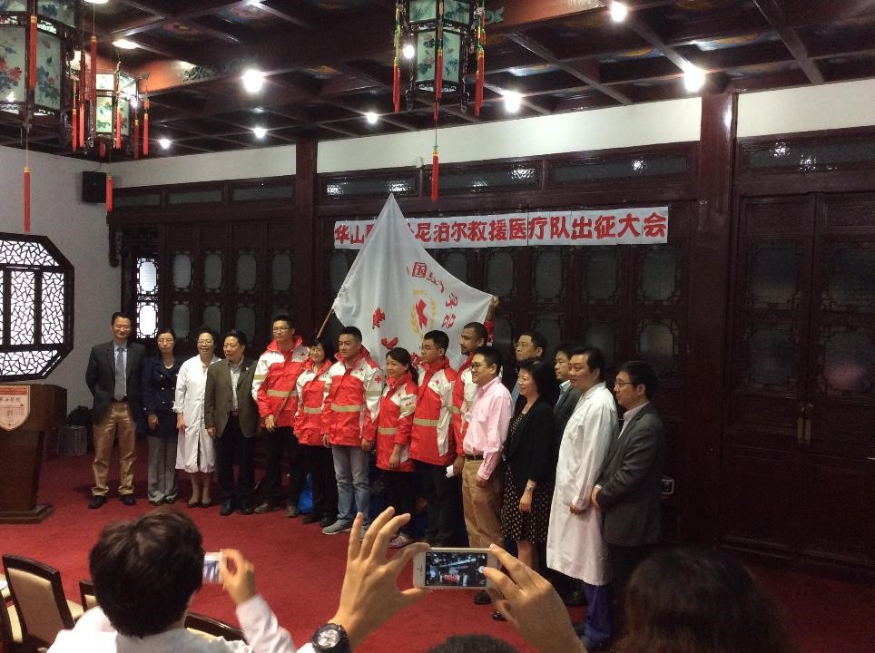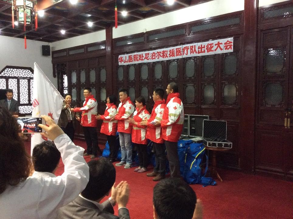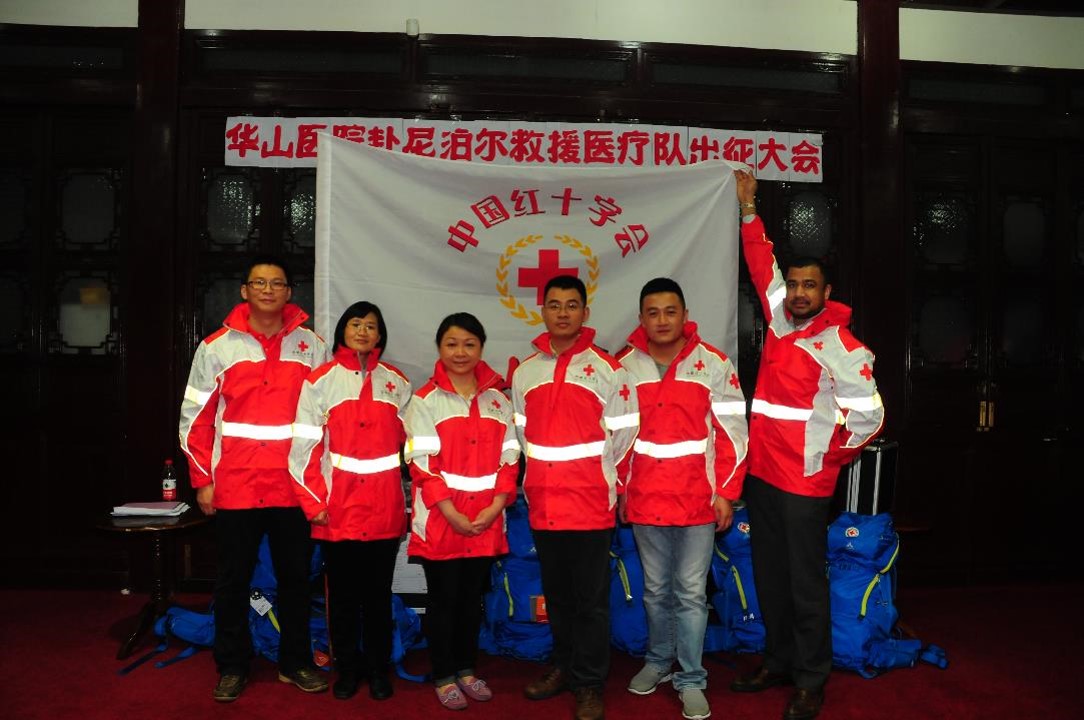 4月25日下午,邻国尼泊尔发生强烈地震。26日中午,华山医院红十字办公室接到中国红十字总会通知后,医务处、相关临床科室立即紧急动员,24小时内即按照要求组成了5人的医护队伍,这5名队员分别是领队刘杨副教授(抗感染专家)、王桂芳副教授(女,呼吸科专家)、许耀主治医师(骨科)、急诊科护士长刘华晔(女)和神经外科重症监护室护士陈裕春,并筹措了队员的个人生活物资、团队生活物资、通讯设备、野外生活装备和药品等。28日上午,医院又接总会通知,要求华山医院在首批5人的基础上,增选10位医务人员作为后续队员。短短2个小时,10人名单确认,包括急诊、感染、外科、妇产科、儿科、护理、超声、药剂、检验、后勤等。