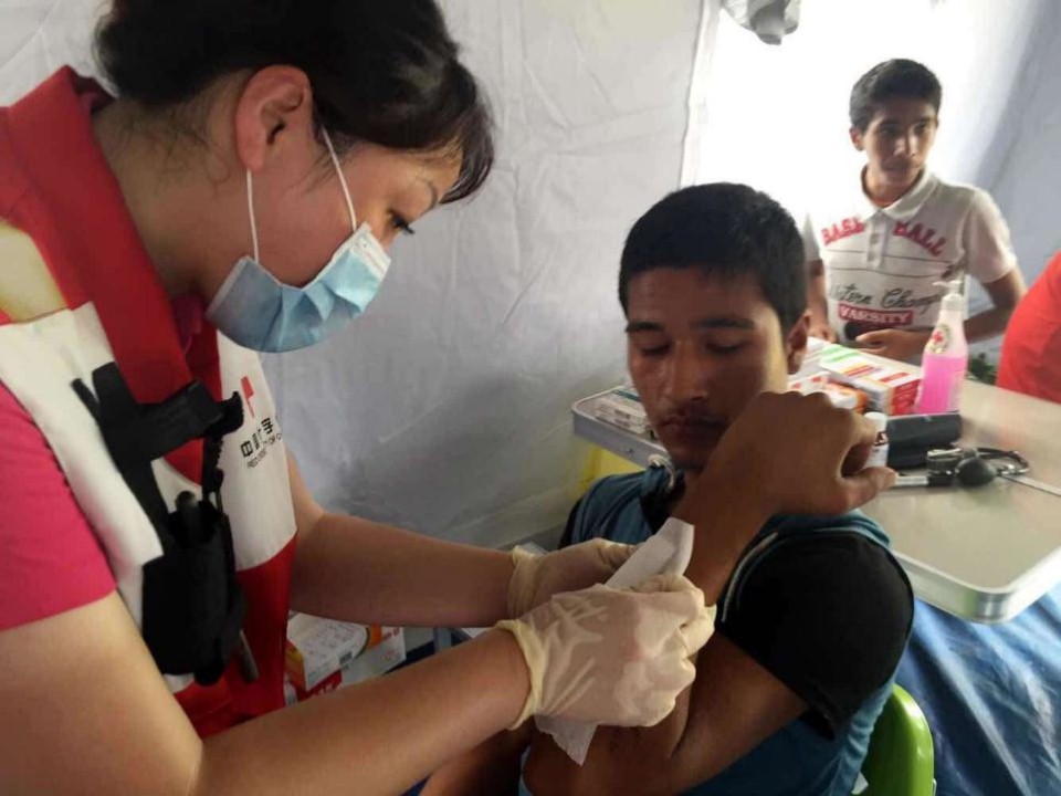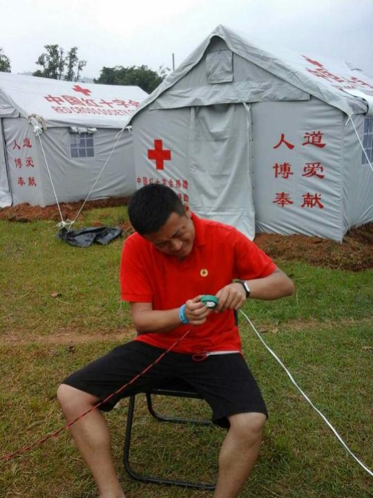我们每天的工作从早晨8点开始,随着来诊村民的增多,气温的上升,帐篷里越来越闷热。可是为了防备夜间下雨,先前布好的象明珠样散落的接线板已收起,而十几个接线板再次重新分布到各个帐篷,并不是一件轻松事。我们强大的 “男丁格尔”队友陈裕春自觉地承担了电工的工作,他用随物资带来的电线将各个插线板拆散并重新组装,把原本需要3~4个插线板连接才能送入医疗帐篷的电通过一个插线板就能完成,并妥善做好电线接口的防水工作。这种工作对我这个中学物理勉强及格的人来说好比登天,敬佩地说:你可真能干,这种技术活也懂。陈裕春谦虚地说:生活及生存必备技能。大约10点时候,3顶医疗帐篷终于全部通电,电扇开始工作,帐篷里终于送来了习习凉风。