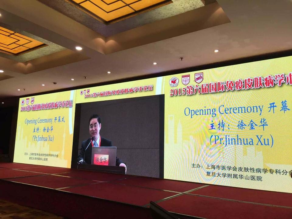 5月10日,风和日丽,由上海市医学会皮肤性病学专科分会和复旦大学附属华山医院皮肤科主办的2015第六届国际免疫皮肤病学术论坛在上海宾馆隆重举行。开幕式由华山医院皮肤科主任徐金华教授主持,华山医院副院长毛颖教授、上海市医学会常务副会长兼秘书长颜世洁教授发表了热情洋溢的致辞。毛颖教授讲述了一段自己手部湿疹紫外线治疗的经历,风趣幽默地道出了皮肤免疫学在皮肤病学领域里举足轻重的地位。颜世洁教授在致辞中以刚获第十三届上海医学科技一等奖的徐金华主任为例,称赞了华山皮肤科在皮肤免疫上取得的成就,对科室举办的学术论坛能成为医学会的品牌学术会议充满了信心。
