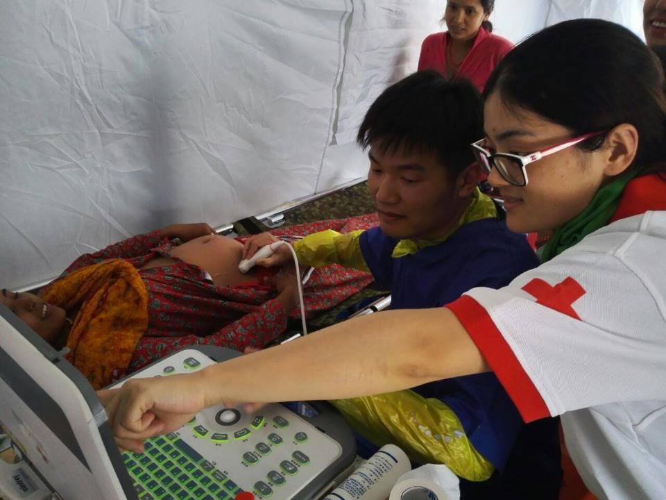 (蔡叶华和曹瑞勤医生在为女患者做超声检查)