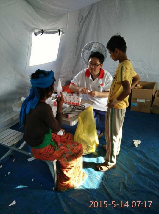 华山医院超声医学科的蔡叶华医生同样是华山超声医学科在中国红会国际救援队中的首秀。蔡医生虽独享一间超声室,但由于设备产热,温度远高于其他诊室。为了保证设备正常运转,蔡医生“冷血”地抢走了大家视为珍宝的电扇,特贡给队里唯一的“神眼”——麦瑞超声仪。大家唯有“望扇兴叹”咯……为了确保门诊的正常运行,队里唯一的护士季玮最为辛苦。由于今天是我们二野的首日工作,大家对药品及医疗器械的摆放、使用都还不熟悉,幸有季玮忙前跑后,端药送针。在“蒸笼”里几个来回,小季已是气喘吁吁,但她一直红着脸坚持着。下午收工时,小季总结经验道,终于明白了东南亚国家妇女的衣着为啥看上去就是裹着一片布——透气儿啊!