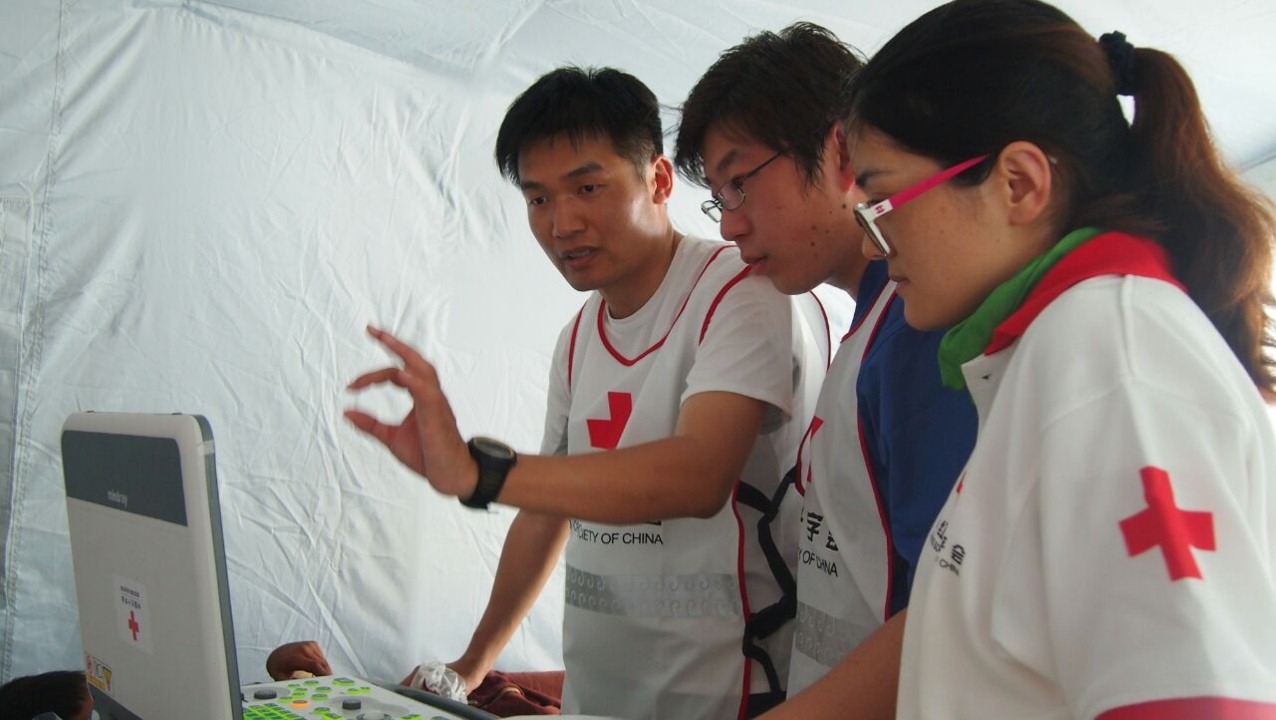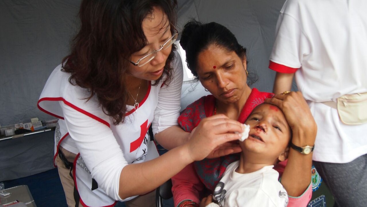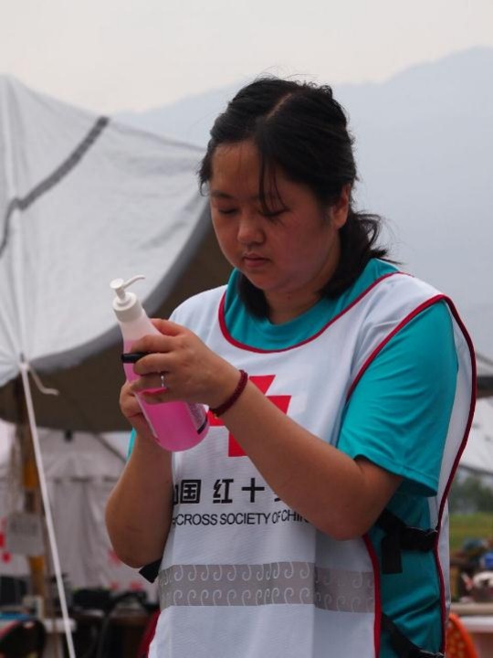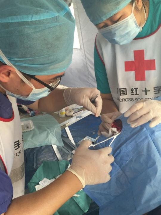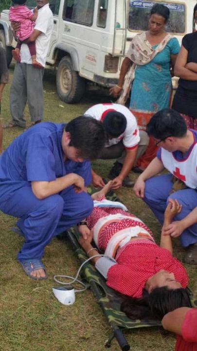 这一天,第二批中国红十字国际救援队的队员们在Nepal的工作依然顺利地展开。在这里工作,队员们面临的挑战不是疑难杂症带来的,而是由于风俗不同、语言不通带来的,有时候,我们在患者的“包围圈”里也只能抓耳挠腮、不知所措。附近村里几位能用英语交流的尼泊尔青年人听说中国红十字救援队遇到了交流困难,主动穿起了红十字小背心,充当志愿者,为我们做翻译、维持门诊秩序。我山医疗队的“教授”们在志愿者的协助下,经过两天磨合,逐渐摸到了门道,渐入佳境。而志愿者们虽然都只是些十几岁的学生(在当地已属较高教育程度),但工作非常认真。经过几个来回,他们很快熟悉了“教授”们的诊疗习惯。“预检/挂号”处的志愿者一见到“肚肚皮”就呼唤曹大夫:She has a baby. Women doctor, next door;抱小孩儿的一进门儿就喊:Baby doctor, baby doctor, you have a patient;病人一坐下来,就直接帮忙问起主诉;发了药,直接指导患者用法。想来,如果干上一两个月,他们都能成为“bare foot doctor”了。
