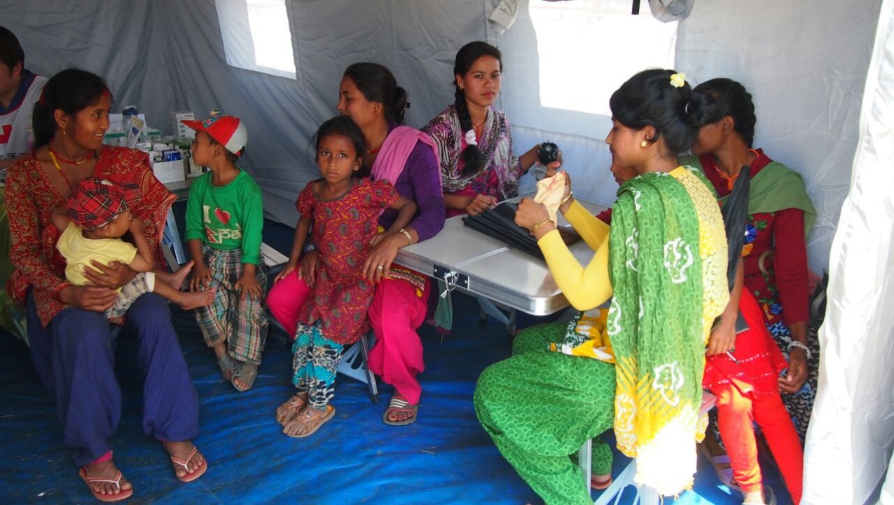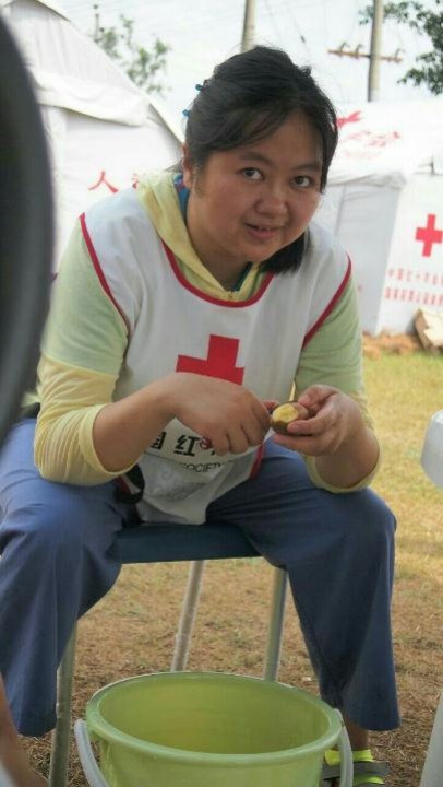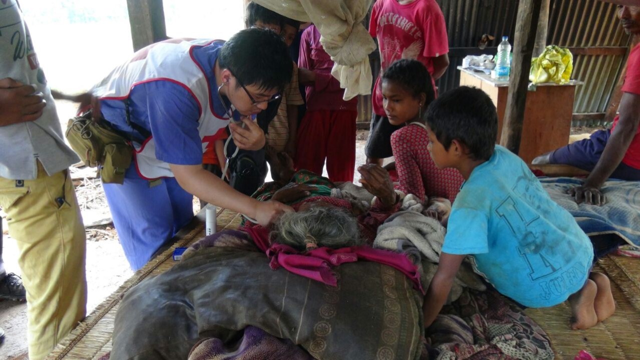 简短地准备了外出诊断仪器和药物,蔡叶华医生和我出发了。一路上,残垣断瓦俯首即是。每个老乡见到身着红十字工作服的我们都会热情主动地双手合十道一声“那么思代欸!”(尼泊尔问候语)。虽然家园在地震中坍塌,他们成了灾民,但即使露宿田边、草棚,他们的脸上依然洋溢着微笑。这是一个充满信仰的虔诚国度,没有喧嚣,没有。