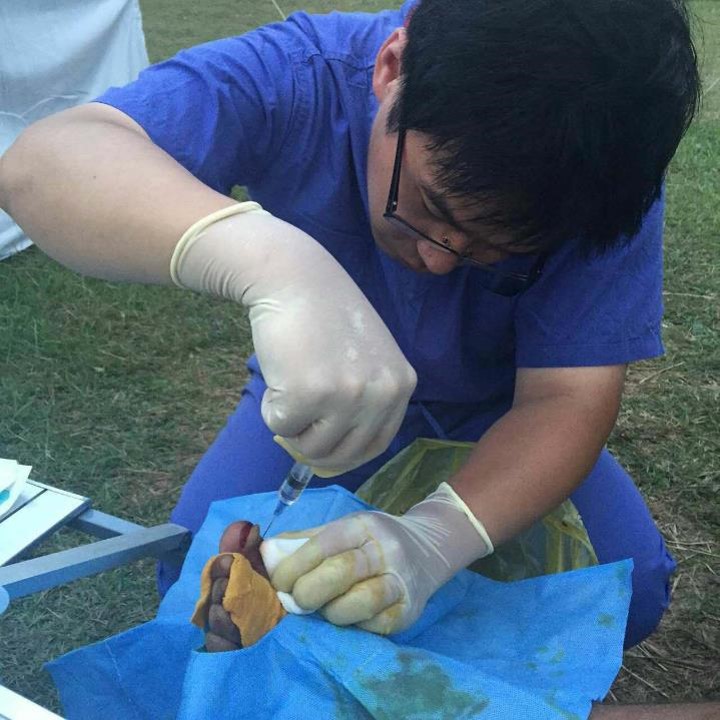 最后一天的门诊依然络绎不绝,直到下午6点“打烊”后大伙正准备着晚餐的时候还来了一名急诊患者。我们的Last patient是一个左足拇趾踢伤后趾甲断裂的病例。一名小志愿者不忍我们最后一天还要加班,直接要求患者次日前往“县城”的医院处理(当地医院下午3点即下班)。但是看到患者足趾淌着血痛苦万分,磊哥二话不说扔下手头的菜,重新打开已经关闭的诊室,接诊。小季、小蔡、小徐分头准备器械和药物。幸好,我们还有一个消过毒的皮切包、一盒利多卡因没有打包,还真派上了用场。