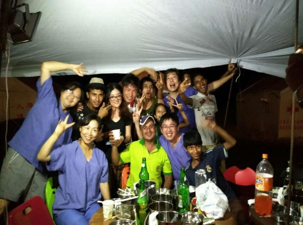 在中国红十字会赈济救护部杨绪生副部长的带领下,所有围坐餐桌的队员和朋友们均用英语做了自我介绍。其实,通过两周工作,队员们早已和志愿者及乡亲们成了挚友。席间朋友们互致问候和祝愿,餐桌上始终洋溢着大家的欢声笑语。茶余饭后大家纷纷用各自的语言高歌。虽然无法理解歌词大意,但大家都能体会到其中歌颂的两国人民的伟大友谊。晚餐持续了很久,最后队员们和志愿者们都依依不舍相互拥抱、道别。