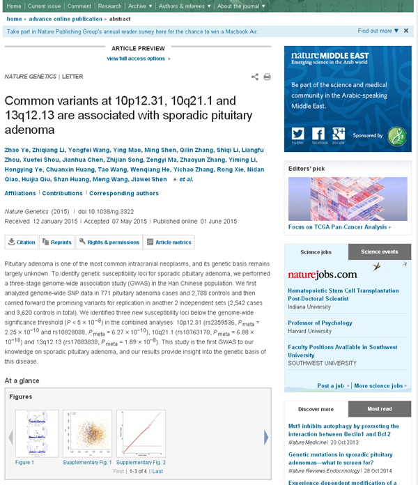 6月1日,国际顶级学术期刊Nature Genetics (自然‧遗传学)(影响因子30)在线发表了复旦大学附属华山医院神经外科和上海交通大学Bio-X研究院共同完成的一项研究成果:通过对大样本垂体瘤病例的全基因组关联分析,研究团队在国际上首次揭示了10p12.31,10q21.1和13q12.13三个基因位点与中国人垂体瘤发病密切相关。这一最新研究成果为深入了解易感基因在垂体瘤发生过程中的作用提供了重要启示。该项标志性成果的取得,凝结着华山医院垂体瘤研究团队全体成员的辛勤付出,也是神经外科长期致力于垂体瘤亚专科建设后获得的国际学术界认可。消息传来,所有人为之欢欣鼓舞。