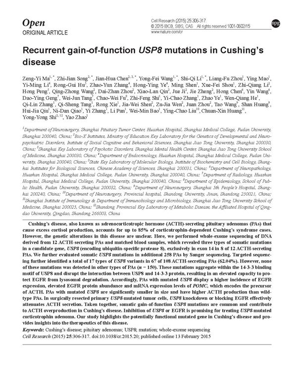 在长期临床病例积累的基础上,专科建立了一个完善的垂体瘤大样本临床数据库和生物样本库,为进一步开展垂体瘤的转化医学和循证医学研究提供了坚实的物质基础。近三年来,共申请到国家科技部863课题1项,国家自然科学基金面上项目4项和上海市科委重点项目1项。发表SCI论著15篇(总影响因子70,最高影响因子30),中华系列论著10篇。特别是针对目前临床上治疗最为棘手的ACTH型垂体瘤(柯兴病),本学科通过与上海交通大学Bio-X中心合作,在国际上同期首次发现ACTH瘤中存在高频的USP8基因突变,该突变与肿瘤的发生和临床表型密切相关,可用于今后ACTH型垂体瘤的靶向药物研发!国际一流学术期刊Cell Research(影响因子12 )于2015年第3期刊登发表了这项原创性的研究成果并进行了封面介绍。