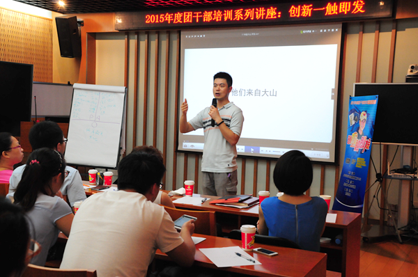8月11日,2015年度团干部培训项目在综合楼四楼启动,首场讲座邀请到了全国青联常委、静安区政协常委、上海创意家创始人、知名公益人张宁,为大家带来一场题为《创新一触即发》的头脑风暴。近80名团干部前来聆听讲座并积极参与现场互动。
