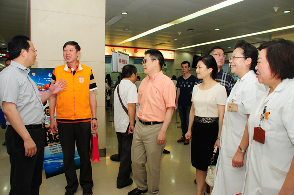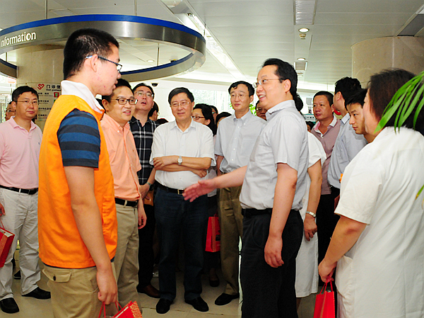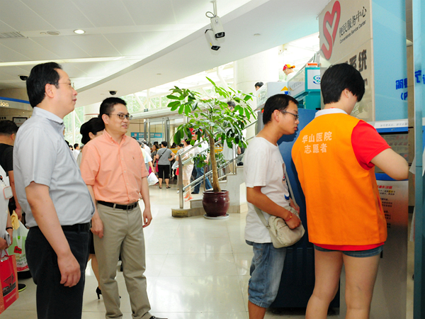 8月20日,市委宣传部副部长、市文明办主任潘敏与市总工会、团市委、市妇联、市教卫党委、市卫计委和上海市志愿者协会等部门20余位领导一大早来到华山医院门诊,在我院丁强院长、顾小萍书记、耿道颖副书记的陪同下慰问了高温坚持参加志愿服务的我院志愿者代表。在便民服务总台、自助服务机前、挂号处等各个岗位,市领导与志愿者们一一握手交谈,询问志愿者的工作、学习单位,志愿服务内容,对医院志愿者工作的理解、建议等。对志愿者的结构多元、年龄层次丰富,市领导表示了赞扬,对于他们的奉献精神,市领导们表示了由衷的感谢,称是他们的存在让上海成为一座更好的城市。