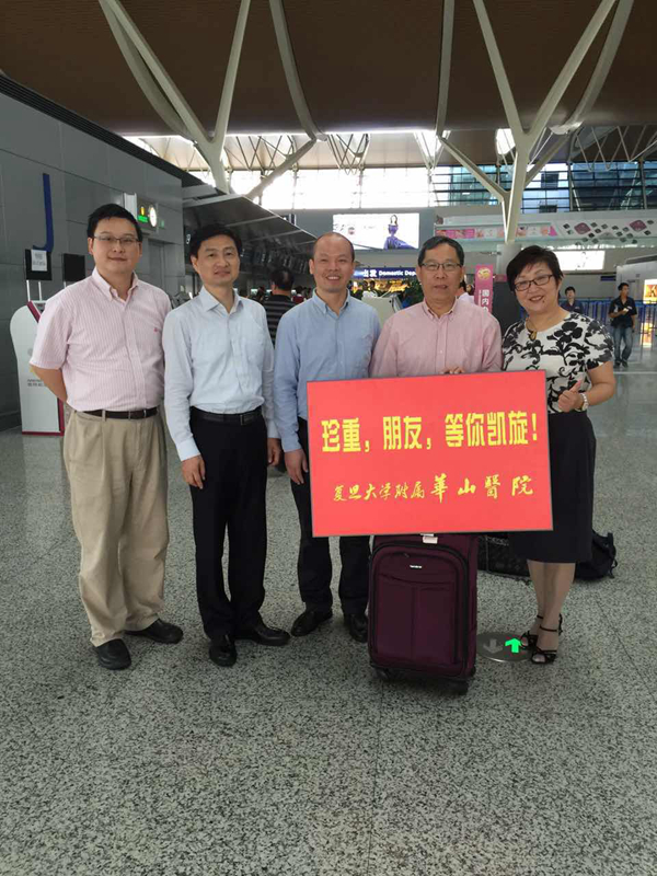 25日上午,胡锦教授、吴军发副主任医师启程赴津,执行预计为期一周的医疗救治工作。党办王晋伦主任、医务处李骥副处长和康复医学科吴毅主任来到浦东机场为两位专家送行。