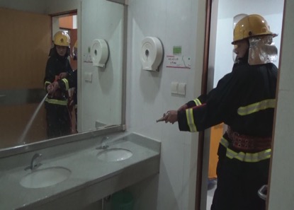 此时,10余名身着消防战斗服的应急小分队队员乘坐消防电梯手持灭火器冲进“火场”,快速从最近消火栓内铺设水带,出水扑救。疏散组保安队员立刻展开人员疏散工作,与此同时,警戒组队员在火场外围拉起警戒线,疏散外围人员。“火势”在强大的水流打击下,逐渐熄灭,一场可能引发的“灾难”被及时遏制!