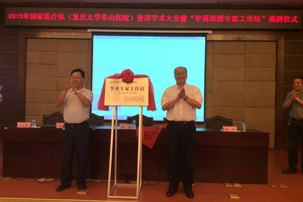 作为在上海的普洱人,医疗队队长李勇教授这次可谓是回到家乡报效父老乡亲了。1979年,李勇教授以普洱地区第二名的高考成绩离开家乡到上海第一医学院求学。事隔36年,8月25日下午,“李勇教授专家工作站”签约仪式在普洱市人民医院会议室举行,普洱市卫计委雷启学副主任、普洱市科技局沈康科长、普洱市人民医院杨文俊院长等院领导、临床各科主任、护士长、职能处室负责人以及华山医院医疗队员出席。这是继长海医院骨科康一凡教授和华山医院手外科劳杰教授建立专家工作站后在普洱市人民医院建立的第三个专家工作站,将为普洱市人民医院医务人员带来最新的临床技术和科研成果,填补空白,自主创新,把心内科打造成云南省重点专科。8月26日下午,在普洱市人民医院学术厅举行了隆重的“李勇教授专家工作站”揭牌仪式。