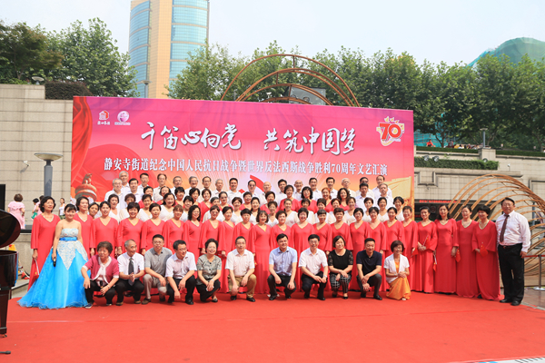 8月30日上午,由静安寺社区同心家园共建理事会主办,柏万青志愿者工作室承办的纪念中国人民抗日战争暨世界反法西斯战争胜利70周年文艺汇演在静安公园下沉式广场举行。华山医院宣传科张沛骅、院工会卢霏主持汇演;急诊科山缨主任带领来自急诊科、骨科、老年科的医护团队共5人为演出提供了全程医疗保障;华山医院合唱队和静安寺街道愚谷村合唱队联袂献曲一首《我的祖国》作为压轴节目,借以向抗日战争中做出英勇奉献的先辈们致以崇高的敬意。院党委顾小萍书记作为嘉宾观赏了演出,并亲切感谢了参演人员的辛勤付出。