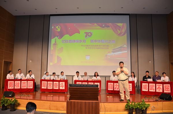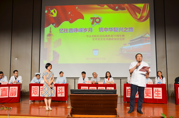 2015年是中国抗日战争和世界反法西斯战争胜利70周年。8月27日下午,“忆往昔峥嵘岁月,筑中华复兴之路——华山北院纪念抗战胜利70周年暨党章党史党风廉政知识竞赛”热烈开赛。华山医院副院长、北院常务副院长汪志明,华山医院党委副书记、纪委书记、北院党委常务副书记邹和建,北院副院长吕飞舟,北院总会计师张强等院领导亲临比赛现场为选手们加油鼓劲。同时,来自北院5个部门工会和5个团支部的近百名医务人员也前来观赛学习,为选手们鼓掌助威,体现出“党建带共建、党建带团建”的积极意义。