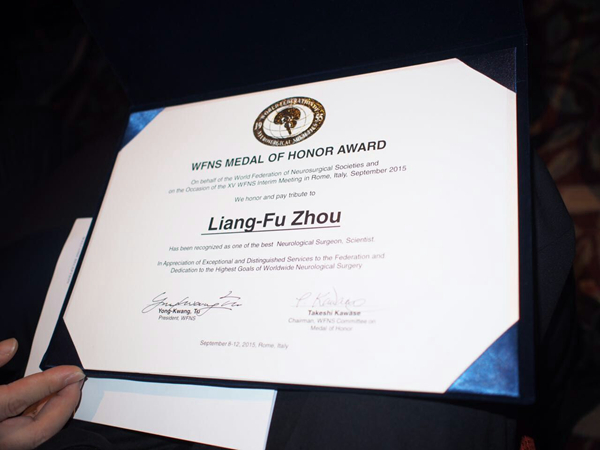 世界神经外科学会联盟成立于1955年,由5个大陆协会、114个全国神经外科学会联合会和5个附属协会组成,拥有全球约30,000神经外科医师。每4年以“荣誉奖章”表彰全球6位著名神经外科医师,2001年,王忠诚院士成为中国首位获此殊荣的神经外科医师。如果说王院士的获奖代表着中国神经外科的崛起,那么,14年后中国第二次获奖则代表着中国神经外科走向辉煌。