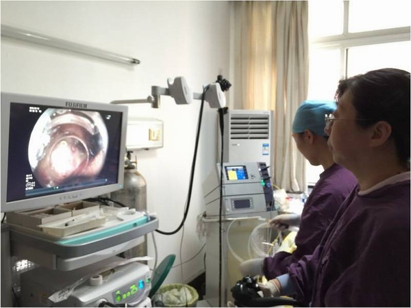 9月18日下午,华山医院消化科刘懿教授在麻醉科汤小炜医生的配合下,成功完成了1例内镜黏膜下挖除术(endoscopic sub-mucosal excavation,ESE),仅用40分钟便将患者胃底体交界处固有肌层间质瘤顺利挖除,并用金属钛夹夹闭创面。48小时后,该患者已能进流食,目前恢复良好。这是华山医院的首例ESE术,标志着消化科内镜下诊疗技术达到一个新高度。