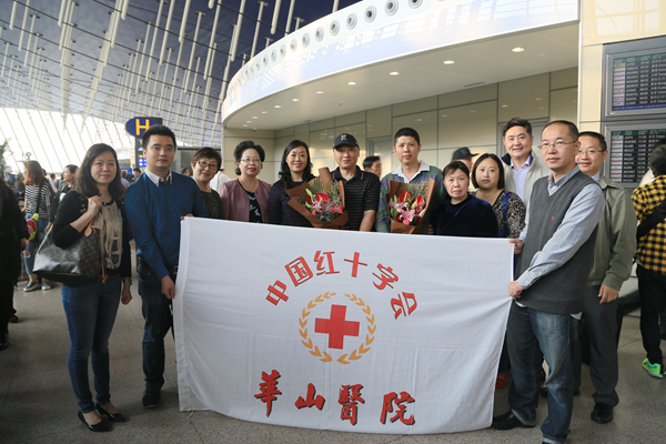 10月22日上午,华山医院普外科医生周坚、后勤保障部总务科高级工成新作为2015年复旦大学援助摩洛哥医疗队成员,于浦东机场出发,赴摩洛哥赛达特执行为期2年的援摩医疗服务工作。院党委顾小萍书记、党委办公室王晋伦主任、工会苏家春常务副主席、后勤保障部卢清主任、人力资源部黄雪飞副主任、总务科沈斌科长、李晨琪科员来到机场为英雄送行。