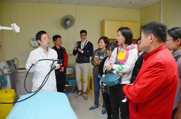 第二站是“看一看消化系统的西洋镜”。孙旭副教授用生动的图片和视频讲解了消化内镜的发展、种类、检查等知识,并向来宾们展示了消化系统常见疾病的形态和胃、肠镜检查的动态过程,还带领大家进入内镜室一睹胃镜和肠镜的“真身”,使参观者对消化内镜和相关疾病有了“震撼”的了解和充分的知晓。