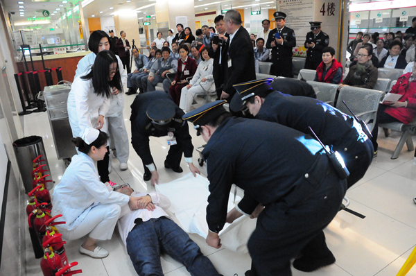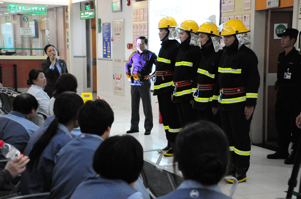 病人突发疾病,倒地不醒,工作人员发现后按流程现场紧急处置;突发袭医事件,全副武装的保安第一时间赶到,平息事态;4楼发生火警,随着警铃、紧急疏散广播响起,员工按照现场指挥的口令,通过5个安全出口迅速保护“患者”撤离。3个模拟场景中,突然倒地的病人,刺耳的警铃,立刻响起的消防疏散广播,放下的消防卷帘门,全副武装的保安和应急小分队都给参加培训的员工留下了深刻的印象。