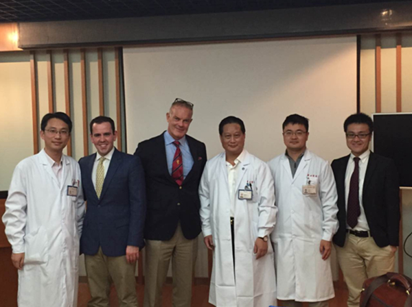 G. Kennedy教授是国际著名的运动医学专家,尤其擅长足踝运动损伤的治疗,长期致力于踝关节和膝关节软骨损伤方面研究,具有很深的造诣和丰富的临床经验。他和他的团队此次带来了3个精彩的学术讲座,详细介绍了踝关节软骨损伤治疗现状以及目前面临挑战,并介绍了他们目前采取PRP(富血小板血浆)治疗距骨软骨损伤所取得的一些成果以及踝关节镜的应用和诊治经验。运动医学科尚西亮博士就微骨折治疗距骨软骨损伤方面的研究与经验进行了交流,陈世益教授、华英汇副教授分别就目前踝关节软骨治疗现状及PRP在运动医学中的应用与John G. Kennedy教授进行了广泛深入的讨论。John G. Kennedy教授对我们目前在踝关节软骨损伤治疗方面取得的成果给予了高度评价,并欢迎我们前去访问他所在的大学和医院,以进一步增进国际交流与合作。