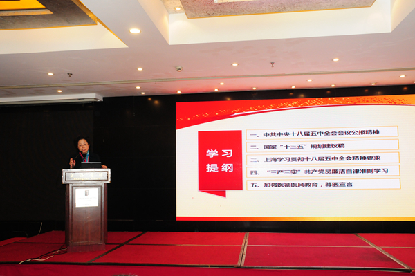11月16日下午,华山医院召开全体中层干部大会,就学习贯彻十八届五中全会会议精神,以及进一步落实“三严三实”专题教育第三专题“严以用权,真抓实干”开展学习。院领导、职能部门负责人、科主任、党支部书记、护士长等200多人参加了中层干部会议。 院党委顾小萍书记传达学习了中共中央十八届五中全会会议公报、国家“十三五”规划建议稿、上海学习贯彻五中全会精神要求等会议精神,认真学习解读了中国共产党员廉洁自律准则、中国共产党纪律处分条例等文件。顾书记希望广大党员和干部在实际工作过程中认真学习领会和贯彻有关文件精神,严格践行“三严三实”专题教育第三专题“严以用权”的内涵和要求,结合复旦大学和华山医院制定