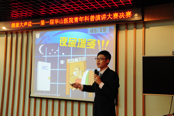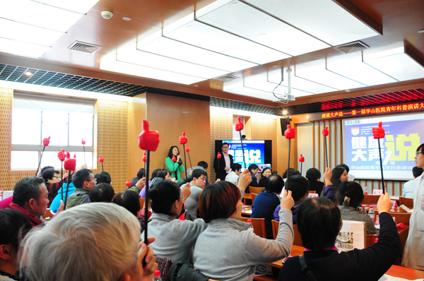 华山的青年讲者们在短短30秒视频、6分钟现场演讲中,表现落落大方、讲述有理有据,把晦涩难懂的医学知识和易被疏忽的医疗资讯用接地气、听得懂的方式说给老百姓听。泌尿外科茅善华医生手拿输液袋一放一捏,生动分享了那些“让前列腺永葆青春的秘诀”;神经内科宋捷医生举一反三,解开了不少困扰中老年人的难题“小卒中,是否需要小题大作”;北院人力资源部吴文斐和小伙伴们以阵容强大、道具精美的小品搭配精彩演讲,让观众在开怀大笑中知道了不仅服务好而且不收费的“家门口的移动医院”……
