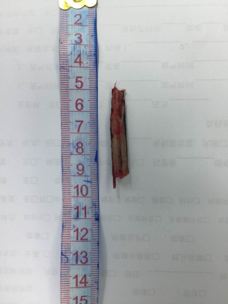 随着胡主任右手稳稳地提起,长达5厘米的“罪魁”小树枝被完整地拔了出来,术野清晰,没有残留和出血。手术一举成功!