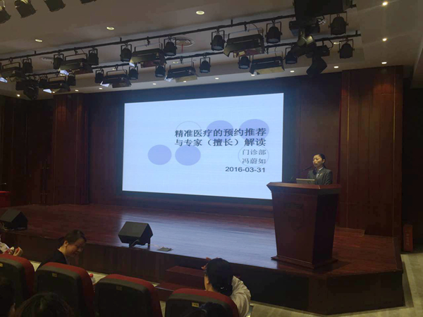 “精准医疗”新概念的提出也给了门诊人很大的启示:我们的服务能不能在患者踏入医院的第一步就“精准”起来呢?3月31日傍晚全天门诊结束后,门诊部在门诊12楼会场举办了2016第一季度全员业务学习,主题就是“精准医疗的预约推荐与专家(擅长)解读”,由门诊部副主任冯蔚如老师主讲,挂号室、收费处、药房、便民服务中心、检验、放射等部门120余名员工参加。冯老师从门诊时间、专家预约、专家擅长,到医院特色科室、业务骨干专业特长的细分,一一做了介绍,方便工作人员指导病人分科室、分专业进行预约和就诊。